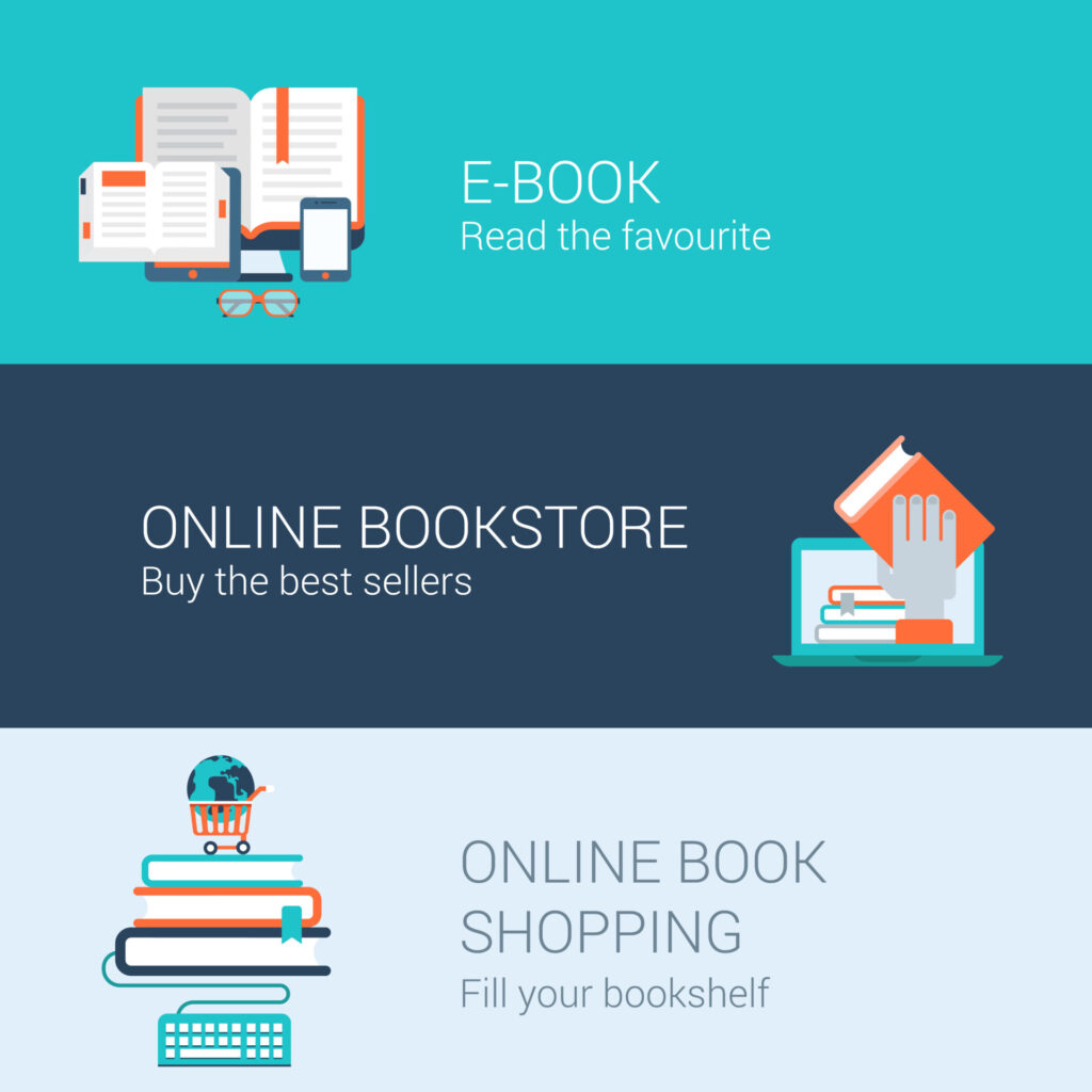 Online books concept flat icons set of e-book reader online bookstore shopping and vector web illustration website click infographics elements collection.